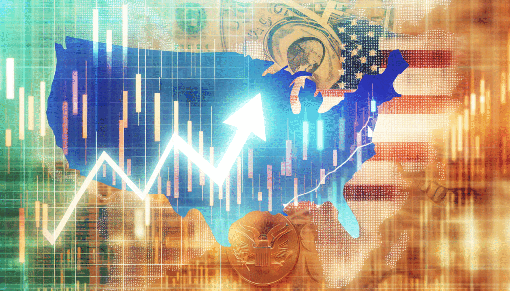 Ein Bild, das das Konzept von US‑Aktienfonds darstellt. Es könnte eine symbolische Darstellung enthalten, etwa ein Diagramm, das das Wachstum von Börsenindizes zeigt, überlagert von der Umrissform der Vereinigten Staaten. Der Hintergrund könnte mit finanziellen Symbolen wie Banknoten, Münzen, Bullenstatuen oder anderen relevanten Finanzikonen geschmückt sein. Wichtig ist, dass das Bild das Konzept von US‑Aktienfonds verständlich vermittelt.