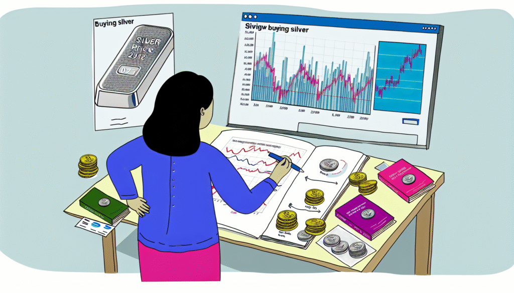 Eine illustrierte Strategie zum Kauf von Silber. Die Szene zeigt einen großen Silberbarren in der Mitte, umgeben von mehreren Diagrammen, die den Silberpreis im Zeitverlauf darstellen. Auf einem Tisch liegen außerdem einige Bücher und Webseiten/Online-Quellen zur Silberanlage verteilt. Eine Person betrachtet die Charts sorgfältig; sie hält einen Stift und ein Notizbuch in der Hand und notiert Beobachtungen. Die Person ist von südasiatischer Abstammung und weiblich.