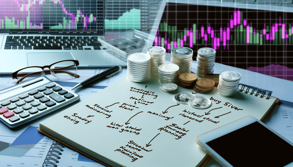Stellen Sie sich ein Bild vor, das das Konzept des strategischen Silberkaufs zeigt. Auf einem Tisch sind verschiedene Silberprodukte wie Münzen, Barren und Schmuck ausgebreitet. Daneben liegt ein Notizbuch mit strategischen Plänen, etwa Preisüberwachung, Analyse historischer Trends und Planung sicherer Aufbewahrung. Außerdem ruhen ein Taschenrechner und eine Brille auf dem Notizbuch. Im Hintergrund ist auf einem Computerbildschirm eine Börsenhandels‑App zu sehen, die Grafiken und Trends der Silberpreise anzeigt.